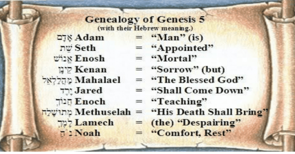 창세기는 전체적으로 10개의 족보로 이루워져 있다. 그래서 창세기는 ‘족보’라는 별명을 가지고 있다. 창세기는 약 2,300여년간 이루어진 역사를 50장에 담고 있다. 그러다보니 창세기 5장은 긴 역사를 족보의 형식으로 압축해서 기록하고 있다. 창세기 5장에 나오는 족보에는 '책'을 뜻하는 '세페르'와 '좁고'를 뜻하는 '톨레돗'이 함께 나온다. 족보라는 말 역시 ‘사람의 혈통을 적어 놓은 책’이란 뜻이다. 다른 족보는 대부분 '톨레돗'이지만 창세기 5장 만큼은 '세페르 톨레돗'이다. 이 말은 창세기 5장의 족보가 단순히 사람들의 이름을 나열한 것이 아니라 하나님에 대한 믿음을 가진 사람들의 책이란 뜻이다. 그만큼 창세기 5장은 우리가 읽는 것 이상으로 하나님의 경륜이 담긴 책이다. 창세기 5장에서는 족보에 나타난 그들의 이름을 통해서 하나님의 은혜를 알 수 있다, 이름은 사람을 구별하는 기호이자 그의 존재를 나타낸다. 야곱은 ‘발꿈치를 잡는 자, 속이는 자’라면 바뀌어진 이름 이스라엘은 ‘하나님과 겨루어 이김’이라는 뜻이다. 하나님은 야곱의 이름이 바꾸어 주심으로서 새로운 인생이 되게 해 주셨다.